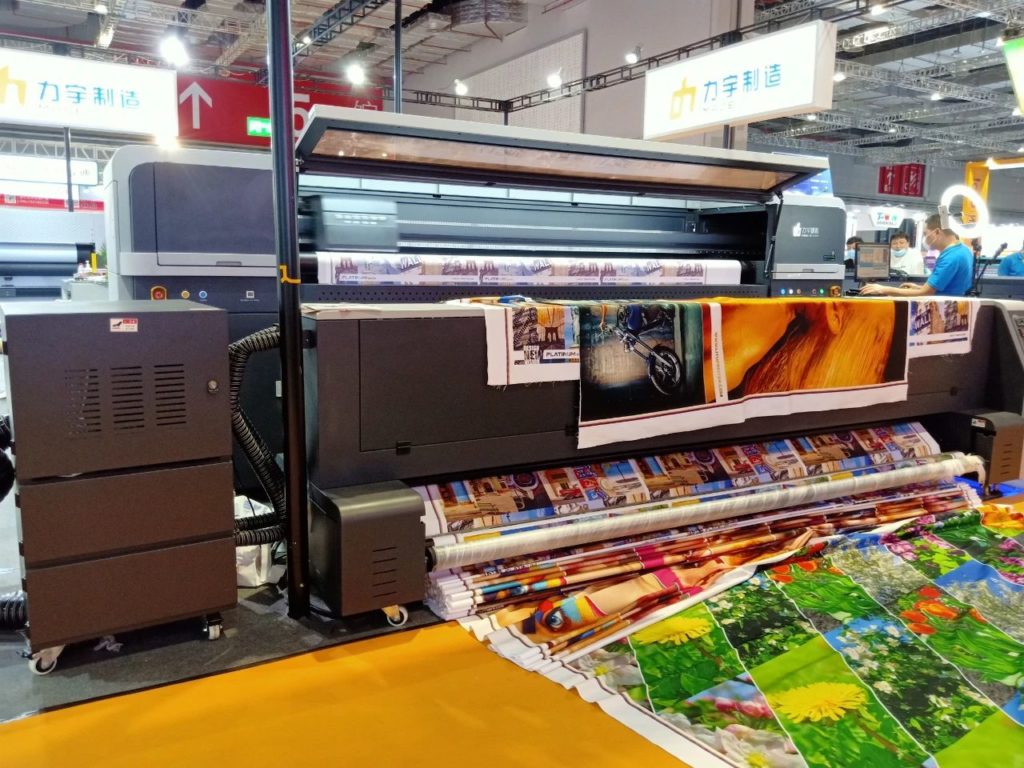力宇除在国内享有名气外更获得西欧主流市场的青睐,在德国、英国、意大利、法国均有广泛的客户基础。这次力宇品牌FH3202-EB采用爱普生S3200-A1打印头,整机配置2头。直喷打印纺织化纤面料,速度轻松达到180㎡/h。现场我们看到纺织面料的打印颜色相当靓丽,客户啧啧称赞。这款设备目前在广告、纺织和家装上都有非常好的应用,销量可观。