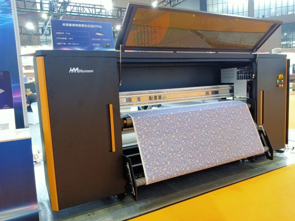 黑迈P-Jet高精度高速度热转印工业打印机定位高端热转印市场,采用爱普生I3200-A1水性头(蒙娜丽莎数码印花机设备上同款打印头), 4头装置,每小时200-400平方米,最大支持8个头卷对卷材料,最宽幅1.9米,打印速度高达390㎡/h,客户看了打印的速度没有不惊叹的。这款设备的订单也很喜人,展会前就已经装了几十台,展会期间,浙江正在装机2台,同时在广州也有一定数量的订单。